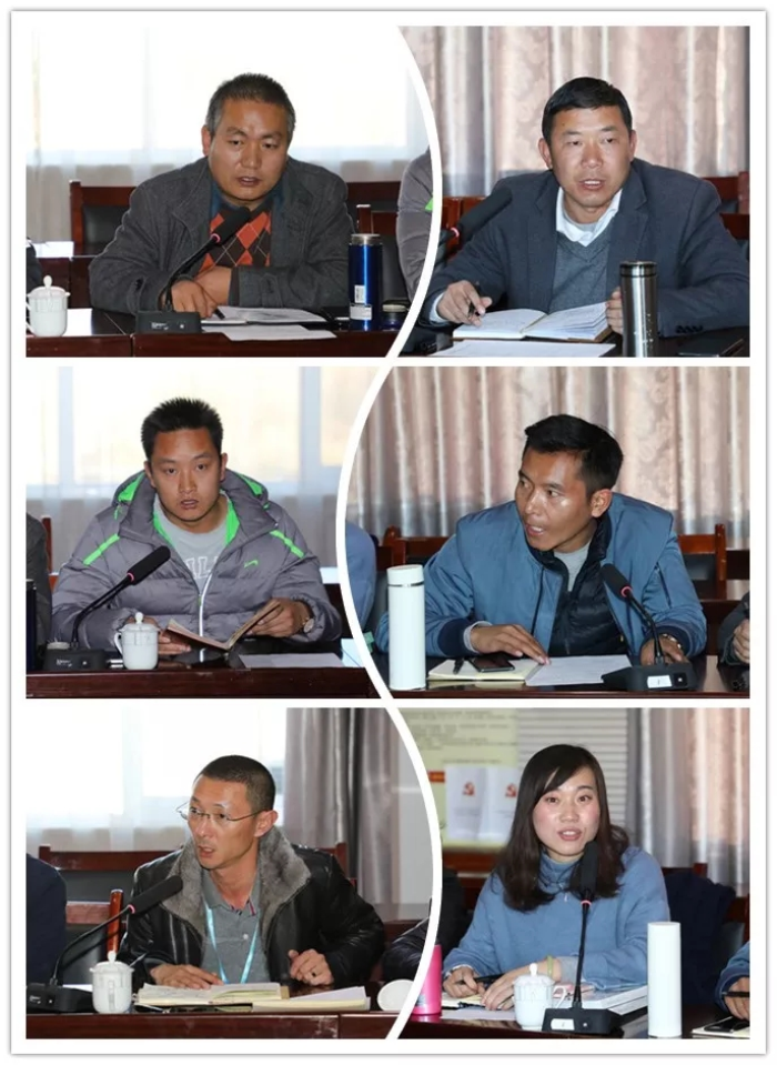 各負責人會上作說明·多杰太(左一) 、田鵬(右一)、羅布次仁(左二)、許鵬杰(右二)、李紀偉(左三)、李麗(右三)