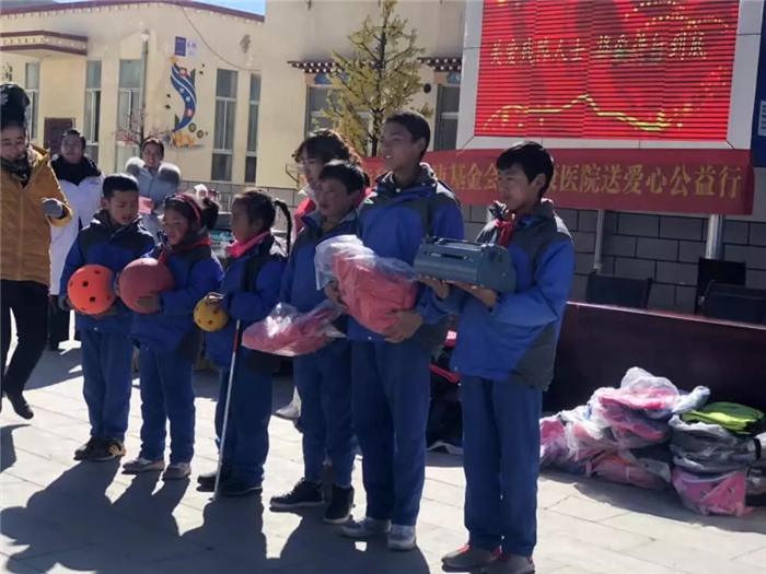 11月1日上午,西藏阜康天使基金會吉拉女士受西藏阜康醫(yī)療股份有限公司黨委書記、阜康天使基金會會長王斌先生,西藏阜康醫(yī)療股份有限公司總經(jīng)理、阜康天使基金會秘書長劉瀟瀟女士委托與西藏阜康醫(yī)院義診隊一起,攜價值一萬五千元的藥品和兩萬元的物資來到那曲市特殊教育學校,為這里的孩子們帶來了文化體育學習用品及藥品等物資。在特校校長次仁拉姆的組織下,特校師生列隊歡迎我們的到來,還精心準備了錦旗和潔白的哈達。