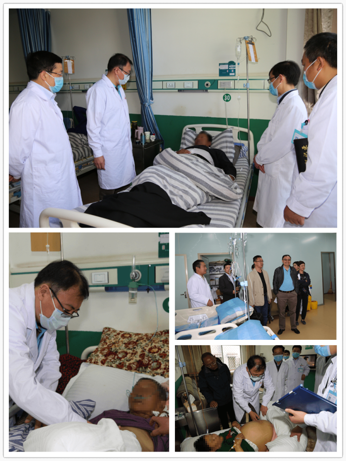 在阜康醫(yī)院住院部,周平紅教授一行換上工作服和阜康醫(yī)院消化內(nèi)科醫(yī)護(hù)人員一起查房。在44號(hào)尼珍的病床前,周平紅教授詳細(xì)詢問(wèn)病人的生理、病理指標(biāo),阜康醫(yī)院醫(yī)護(hù)人員一一詳細(xì)回答。之后,周平紅教授走到病床前對(duì)患者的體征狀況進(jìn)行了仔細(xì)檢查,并向家屬詢問(wèn)病人的實(shí)時(shí)病況。周平紅教授還來(lái)到89歲的患者扎西、離退休人員格桑的病床前,詢問(wèn)了病人的各項(xiàng)指標(biāo)并仔細(xì)進(jìn)行了體征檢查。